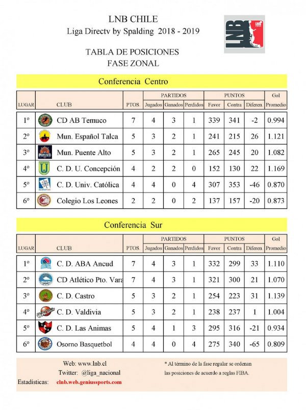 El pasado fin de semana se disputaron dos nuevas fechas de la etapa zonal de la Liga Nacional de Básquetbol, con los equipos de AB Temuco, CD ABA Ancud y Atlético Puerto Varas, como los líderes de las Conferencias Centro y Sur.