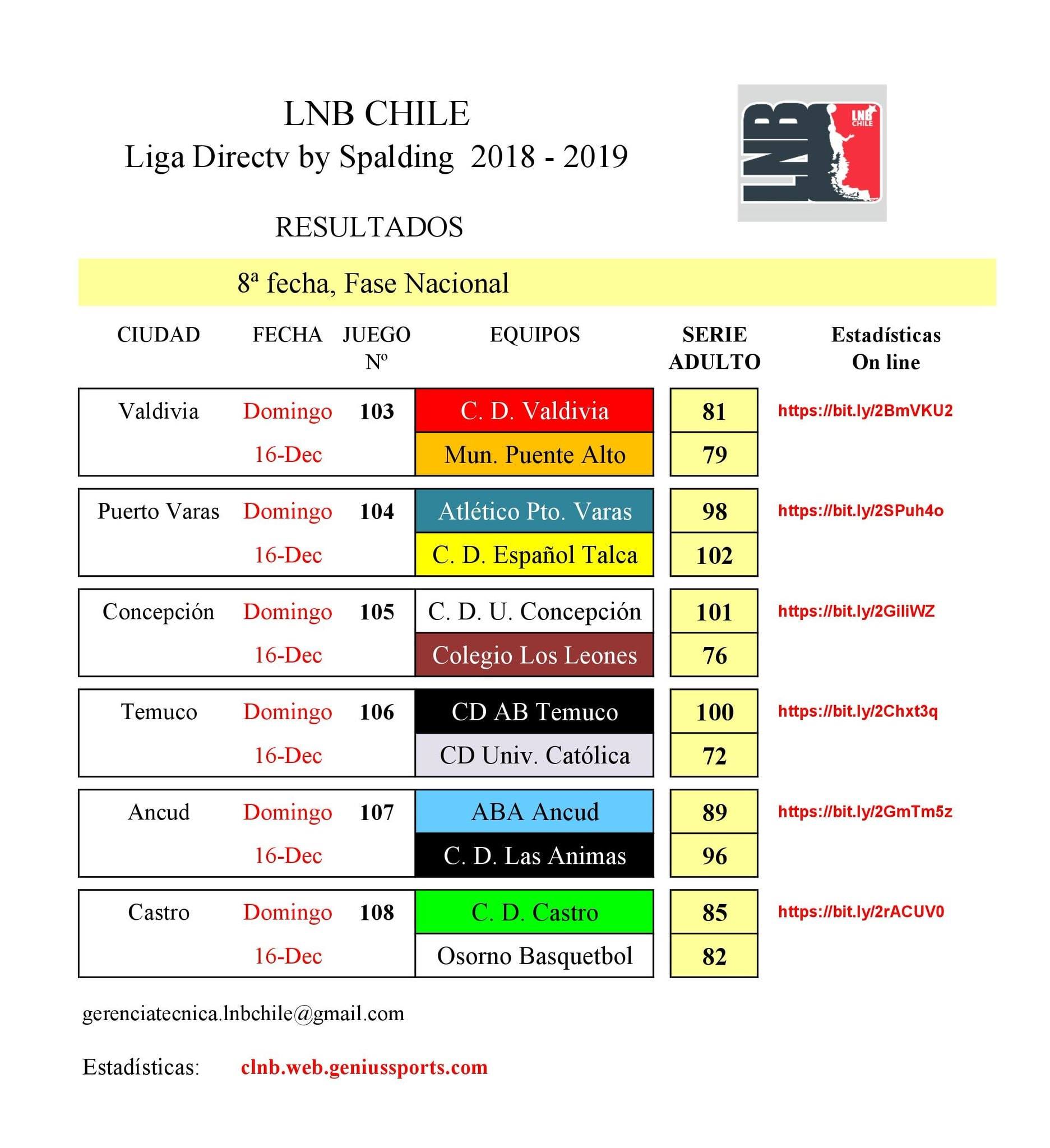 En el resto de los partidos del día domingo, CD Valdivia se impuso como local a Municipal Puente Alto por un estrecho marcador de 81-79; CD Español de Talca viajó a la Región de Los Lagos, derrotando por 98-102 a Atlético Puerto Varas; Universidad de Concepción se impuso claramente, como local, a Colegio Los Leones por 101-76 mientras que CD Castro derrotó, como local, a Osorno Básquetbol por 85-82.