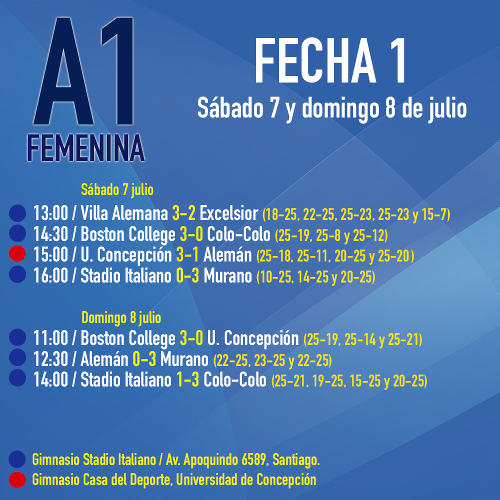 Con una victoria y con 3 puntos en la tabla están los sextetos de Colo-Colo y Universidad de Concepción. Las albas derrotaron por 3-1 a Stadio Italiano y las del campanil superaron por el mismo marcador a Alemán.