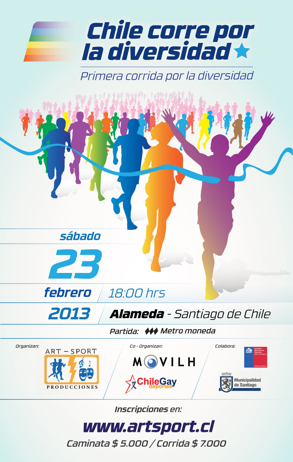 La empresa de deportes Art Sport, el Movimiento de Integración y Liberación Homosexual (Movilh) y Chile Gay Deportes invitan al evento denominado Primera Corrida por la Diversidad, evento inédito a desarrollarse en la Alameda el próximo sábado 23 de febrero con el fin de contribuir a erradicar la discriminación y promover los derechos humanos de todas las personas y familias.