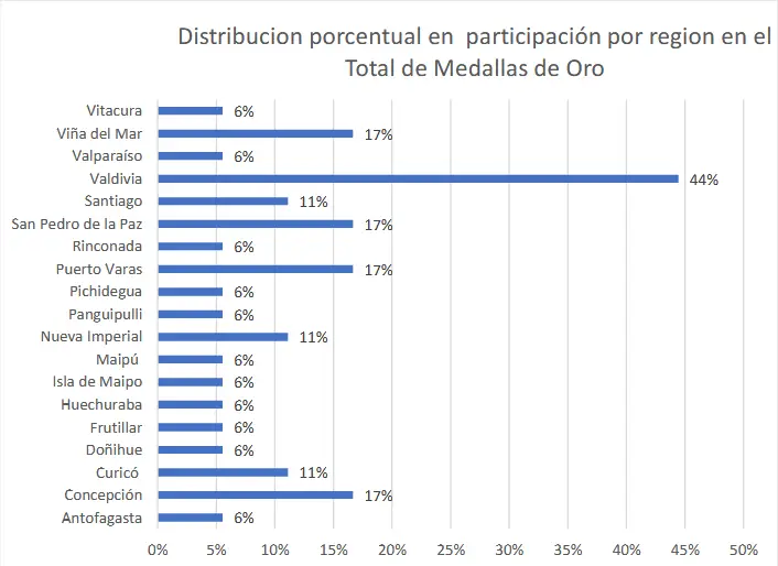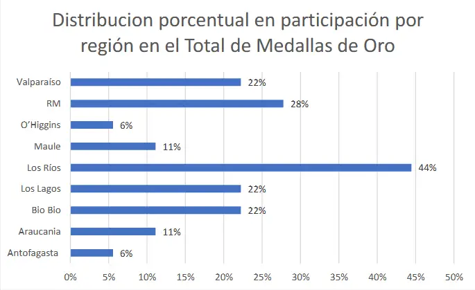 A modo de ejemplo y sobre la base del paradigma positivista y descriptivo, se observa un importante aporte de medallas de oro como: remo, ciclismo, tiro, esgrima, canotaje, entre otras, donde más del 70% de los deportistas jóvenes pertenecen a comunas y regiones del país, tales como Los Ríos, Maule, O’Higgins, Antofagasta, Valparaíso, Bio Bio, Los Lagos, Araucanía, entre otras (figura 1).