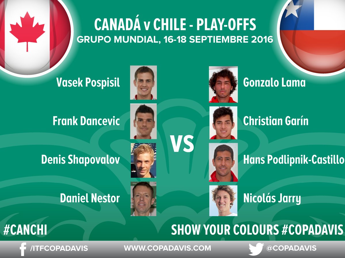 Así quedó establecido luego de que se hiciera oficial el equipo norteamericano, donde el principal jugador será Vasek Pospisil (123° en singles y 14° en dobles), quien será secundado por Frank Dancevic (224°), el joven de 17 años Denis Shapovalov (246°) y el veterano especialista en duplas Daniel Nestor (12° de la especialidad).