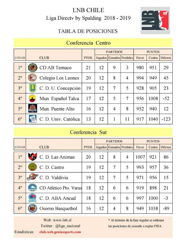 Por su parte, el líder de la Conferencia Norte, CD AB Temuco, tuvo resultados de dulce y agráz. El día sábado, los de la IX Región cayeron, como local, por 74-81 ante CD Deportes Valdivia. El domingo, sin embargo, se recuperaron al derrotar por 67-60 a Atlético Puerto Varas. Así, el equipo temucano logra 21 puntos en 12 partidos.